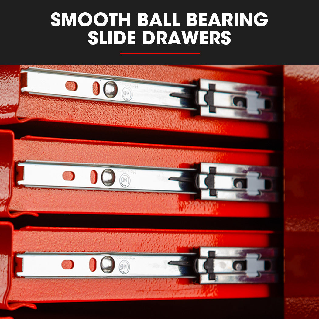 The cabinet is built with a high tensile powder coated steel enclosure. Equipped with an EVA mat, each drawer slides effortlessly in and out on smooth ball bearing rails, which makes finding and accessing each tool a cinch.