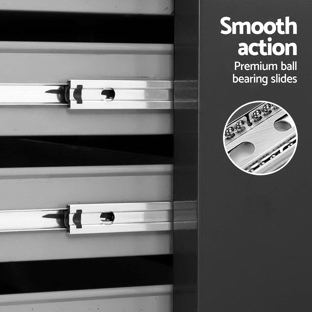 This robust, multi-drawer Giantz Tool Trolley is an essential for any workshop. Crafted from durable steel, it features smooth ball-bearing slides for easy access and a secure lock system for safety. Its spacious design includes varying drawer sizes to accommodate tools of all shapes, complete with non-slip liners. The chest is also mounted on omni-directional castors with locakble front wheels, ensuring a smooth maneuverability and stable positioning. Sleek and functional, it's perfect for organizing and protecting your valuable tools.