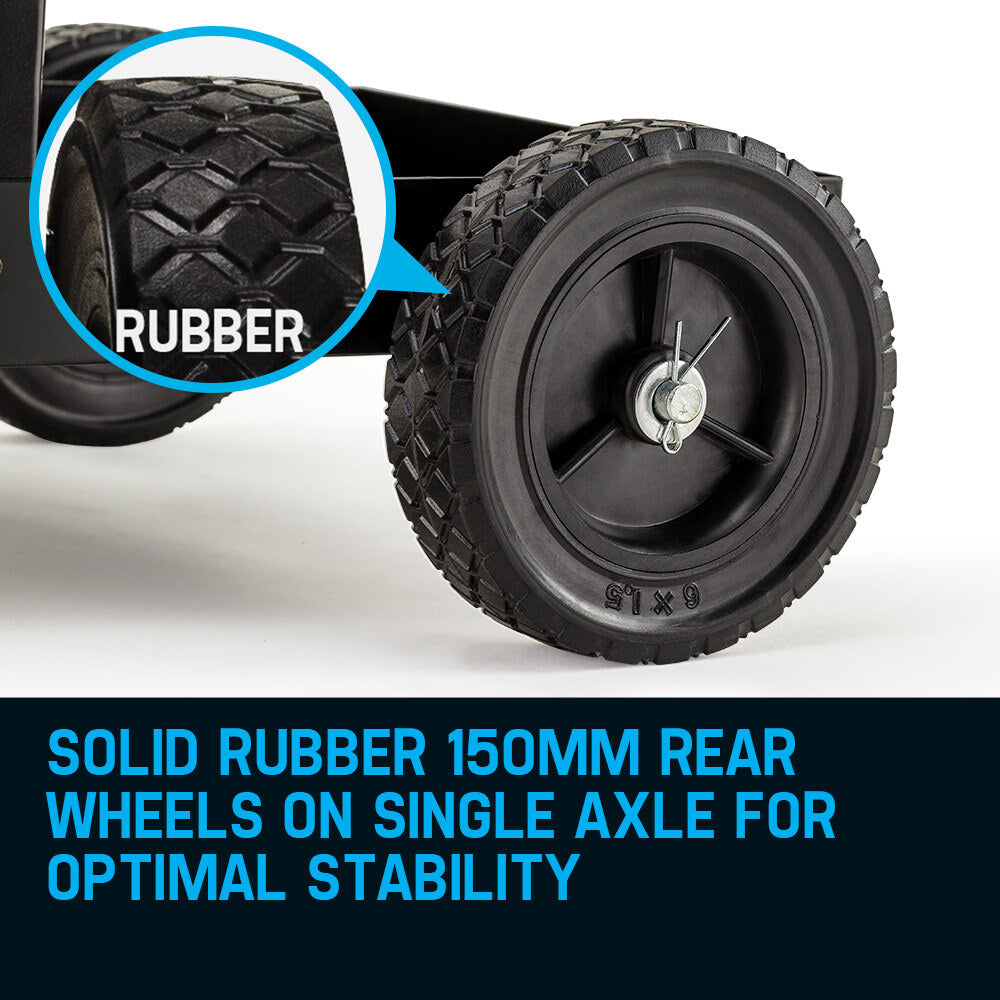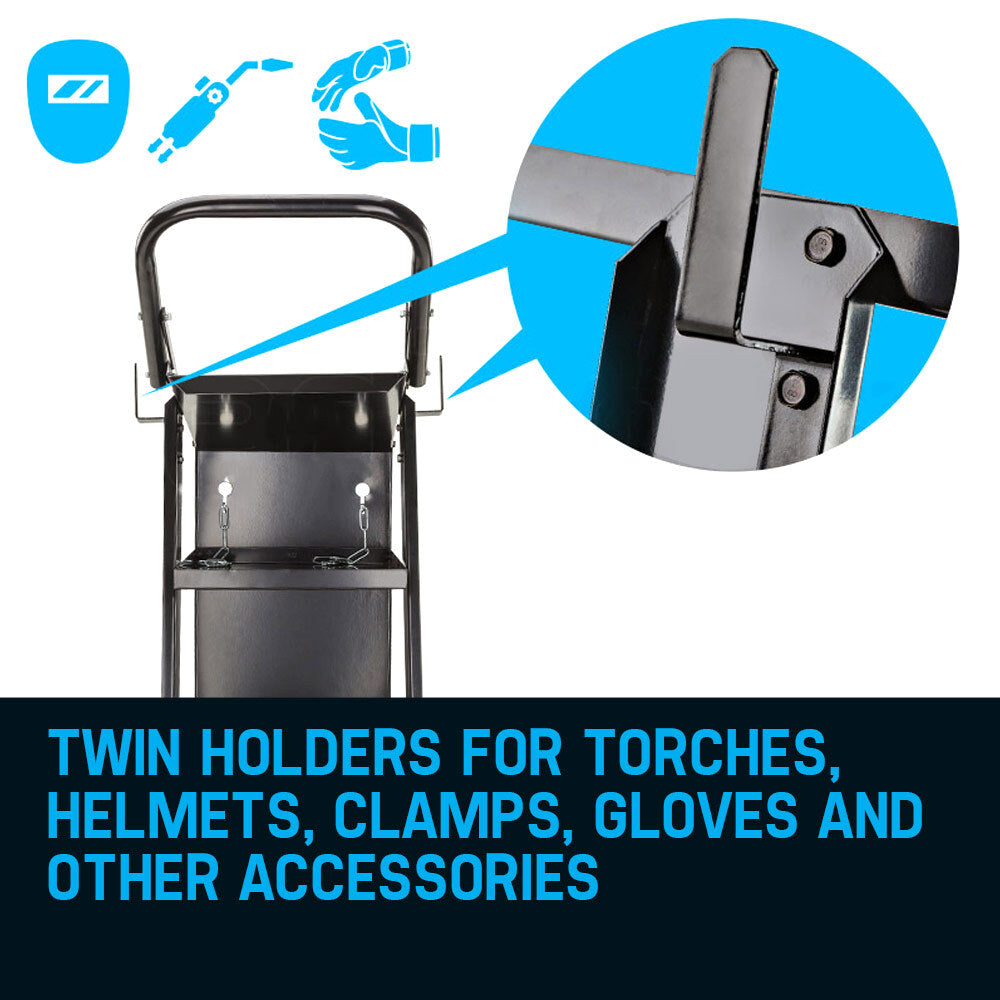 Of course, fun as it is, welding does ask for a strict safety protocol - and you can rest assured that the Rossi Deluxe ticks the boxes. Designed in powder-coated commercial steel, it features solid build quality throughout, with details such as a single wheel axle, spring washers and double tank chains being a given. This translates into a carrying capacity of some 50kg; you can load her up to your heart's content.