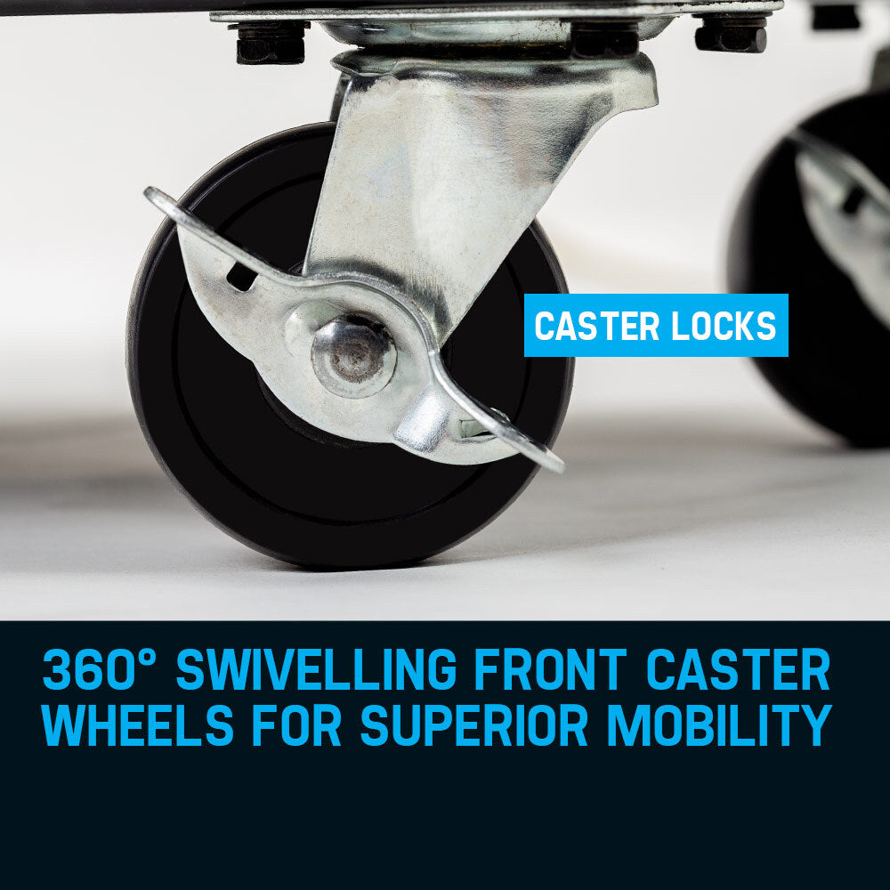 In search of the perfect weld, you should forget all worries behind and steady your hand. The Rossi Deluxe makes sure you can. With plenty of space for the welding unit, wires, rods, mask, tungsten nozzles and everything else that's required for a successful fusion, you can focus entirely on the work at hand. And you can work quickly too thanks to its solid-rubber rear wheels and nimble 360 swivelling front wheels with brake, your Rossi Deluxe is a breeze to move around the workshop.